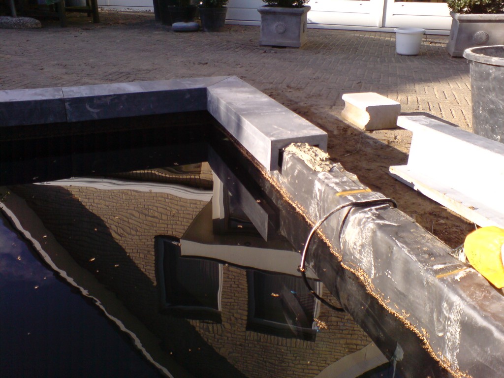 All pondcovers are availeble in 20 and 30 cm wide.and 1 mtr long,the total high of the pondcovers U profile is 10 cm.The corners are prefab 45 degree cut ,so this is for both pieces a nice corner of 90 degree.the range of pondcoverplate is very big, it is availble in granit 654 honed, basalt 684 honed ,flamed/bruched and pollish.also there is one mongolieen black we have this in flamed bruched ,and is specialy for the swimmingpool ,because for the finnish is is a raw top and nor slippery.