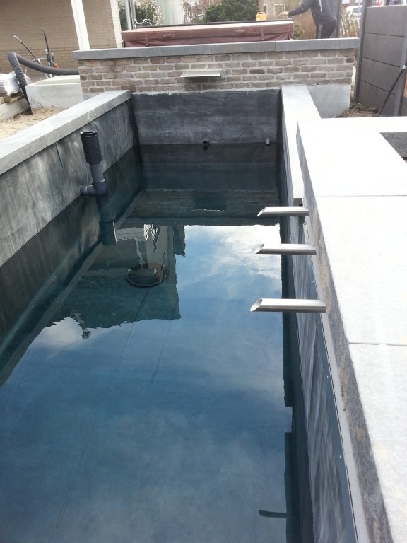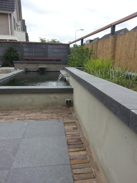 Koivijver te Duiven 30 m3 inclusief onze technische ruimte incl zeef/uv lamp en pomp plugg and play systeem.Vijver opgemetseld met bia blokken van 20 cm , deze vijver staat 40 cm boven maaiveld , dus moet wel vorstvrij opgemetseld worden,koivijver is voorzien van plantenfilter van 50% van het oppervlak zodat er een goed biologisch evenwicht ontstaat.De overloop uit het plantenfilter is gemaakt met rvs doorstroompijpjes en de achterzijde is voorzien van een waterval 50 cm breed , geheel is perfect in balans en voorzien van 2 onderwaterspots die de waterval en de doorstroompijpjes aanlichten.