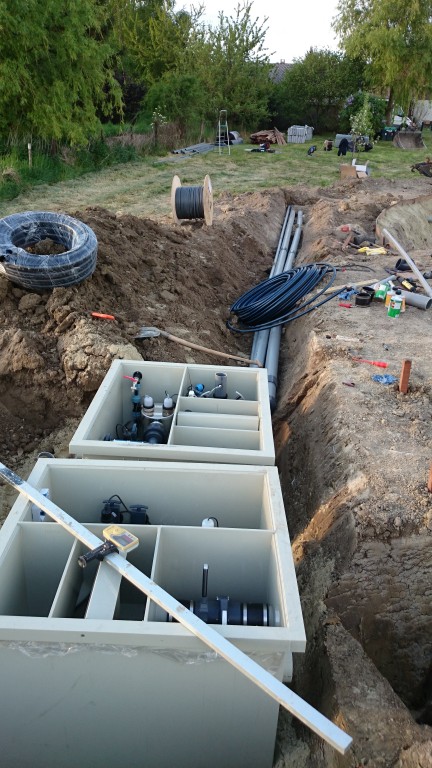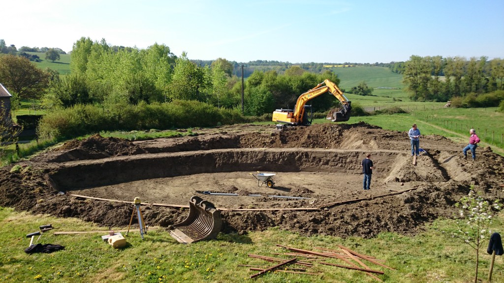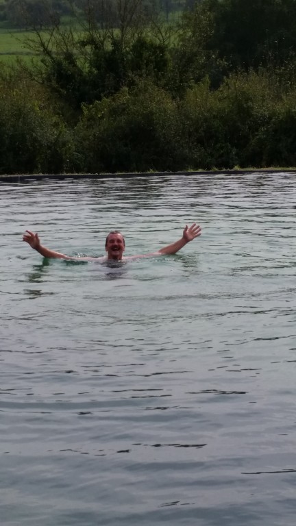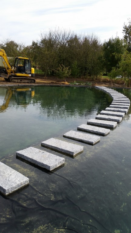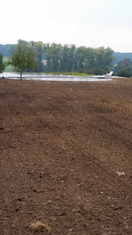 Zwemvijver te frankrijk aangelegd april 2014 , 850 m3 inhoud en voorzien van 2 technische ruimtes met een pompcapaciteit van 50 m3 per uur. Geheel voorzien van 380 watt UV vermogen, en een plantenfilter met 30 m3 filtermateriaal,afscheiding gemaakt voor kinderen en gevorderden d.m.v. een dam die voorzien is van stapstenen die weer aansluiten op een hardhoutenvlonder van 24 m2 ,gehele werk is uitgevoerd in 3 dagen,Deze vijver is aangelegd in het champagne/ardennes gebied ,en heeft een prima klimaat om deze vijver op een natuurlijke manier op te warmen. tot een graad of 23-24 ,Na deze aanleg in april hebben we in september de rest van de tuin aangelegd, hierbij hebben we zo'n 150 ton grond aangevoerd en alles mooi vlak gemaakt d.m.v freesen,uitvlakken met een kraan ,culverbak en een kop egg, hierna ingezaaid en tevens even een duik genomen in het glasheldere water.ook hebben we de vijverbodem schoongezogen met een slib zuiger (zie foto 2 mtr diep en glashelder water).Kortom ook en september wederom een mooie klus geklaard in marcq.